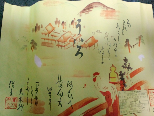 昨日、買ってきた長田のういろやさんのういろうですが、包装には、夫木和歌抄(ふぼくわかしょう、夫木抄、鎌倉後期の私撰和歌集 (http://tois.nichibun.ac.jp/database/html2/waka/waka_i070.html) )の歌のひとつ、「あめつゆも-めくみあまねき-ときにあひて-なかたのさとに-さなへとるなり」が書かれています。